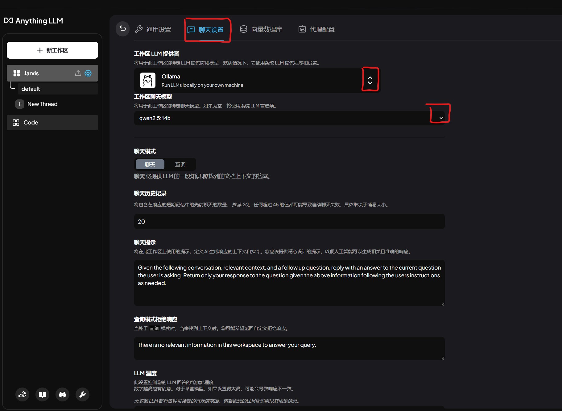 启动 ollama 服务,可以在聊天设置中的工作区 LLM 提供者找到 ollama,将工作区聊天模型设置为想要的模型,最后移到最下方点击 Update workspace。这样就能进行聊天了。