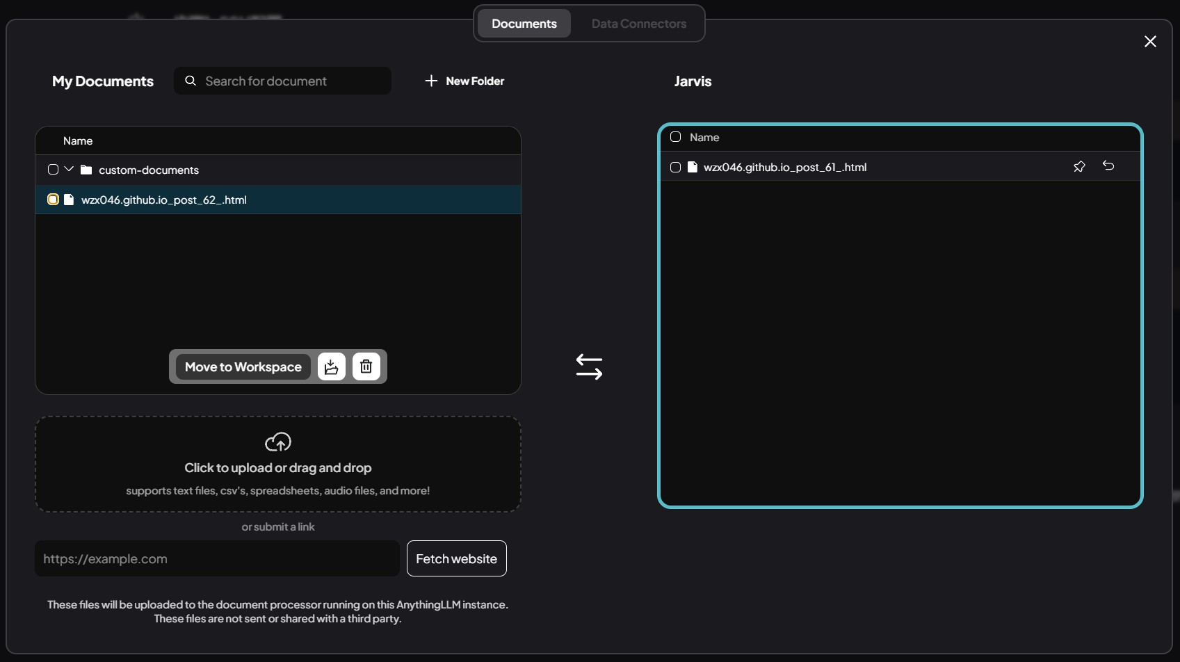 Move to Workspace,点击Save and Embed,本地知识库就搭建完成了。