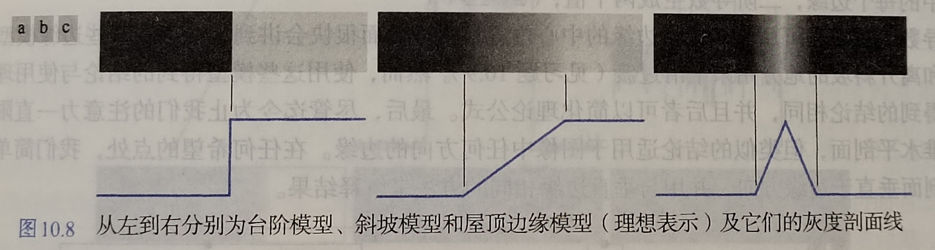 - 台阶边缘模型:在1个像素的距离上发生两个灰度级间理想的过渡,即这两个灰度级过渡时存在一条较为明显的分界线