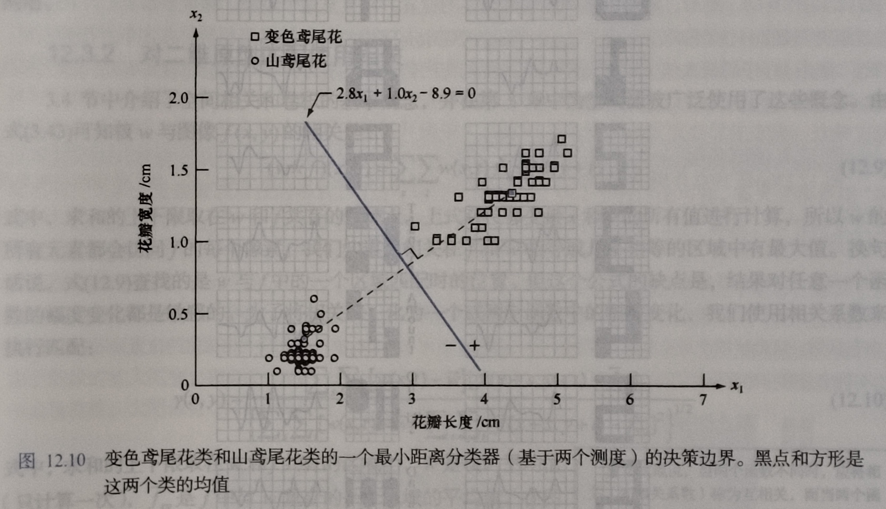 来自 $c_1$ 类的数据带入上式得到 $d_{12}(x) > 0$。相反,来自 $c_2$ 类的数据带入上式得到 $d_{12}(x) < 0$.如果有一个未知模式 $x$ 属于这两类,只需要带入式子,$d_{12}(x)$ 的符号可以确定类别。