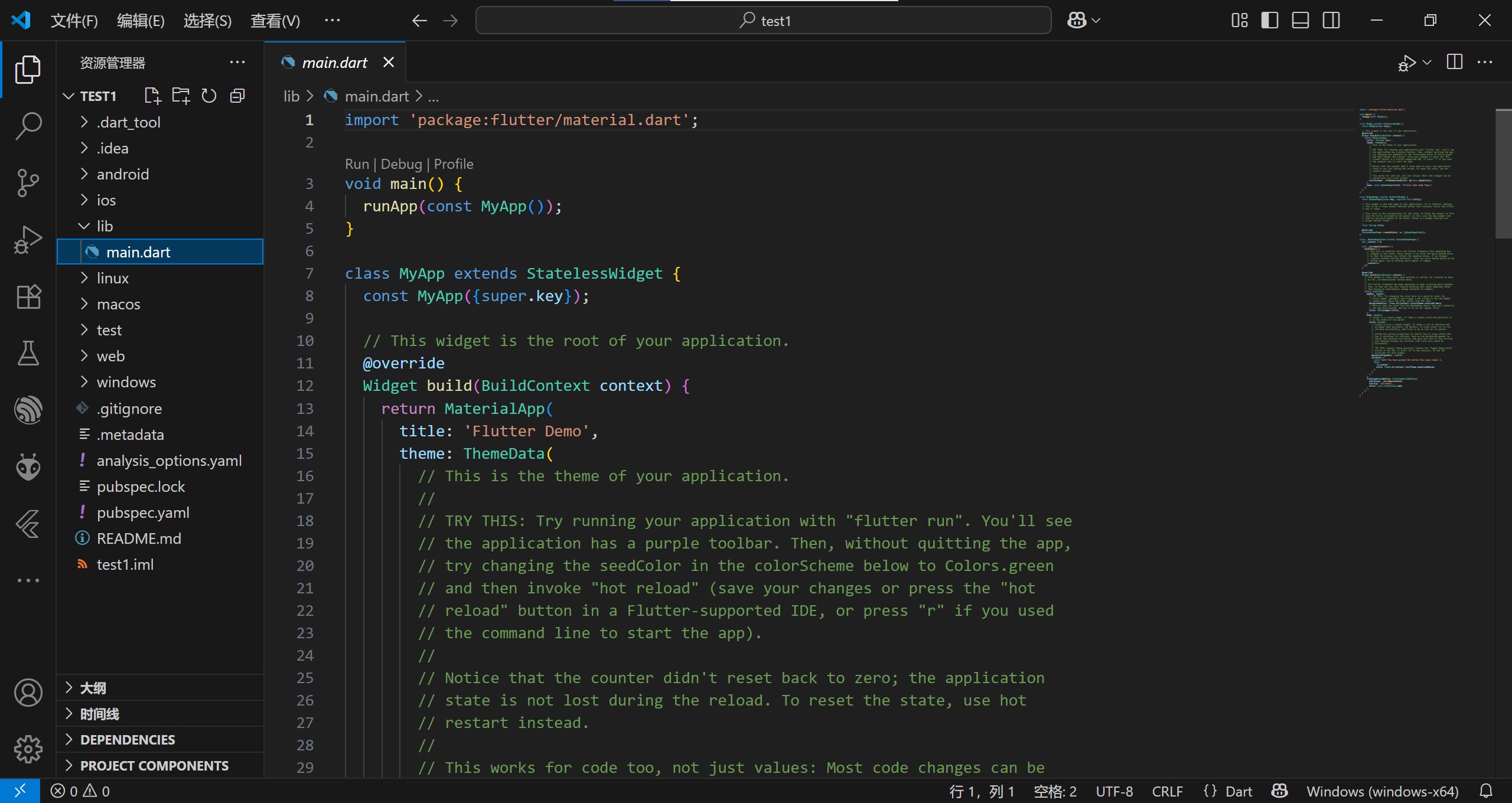 在创建的新工程中,可以看到已经自带了Android,IOS相关的运行环境。其中入口主文件是 lib 下的 main.dart,项目的配置文件是 pubspec.yaml。